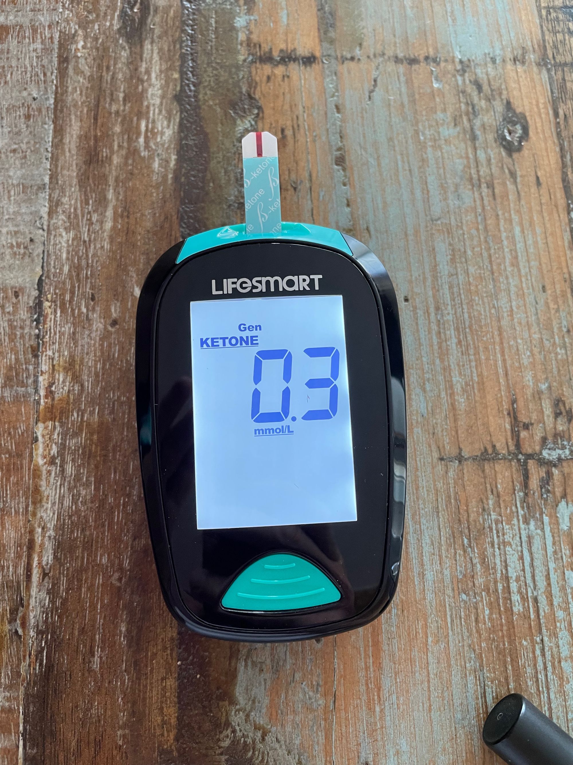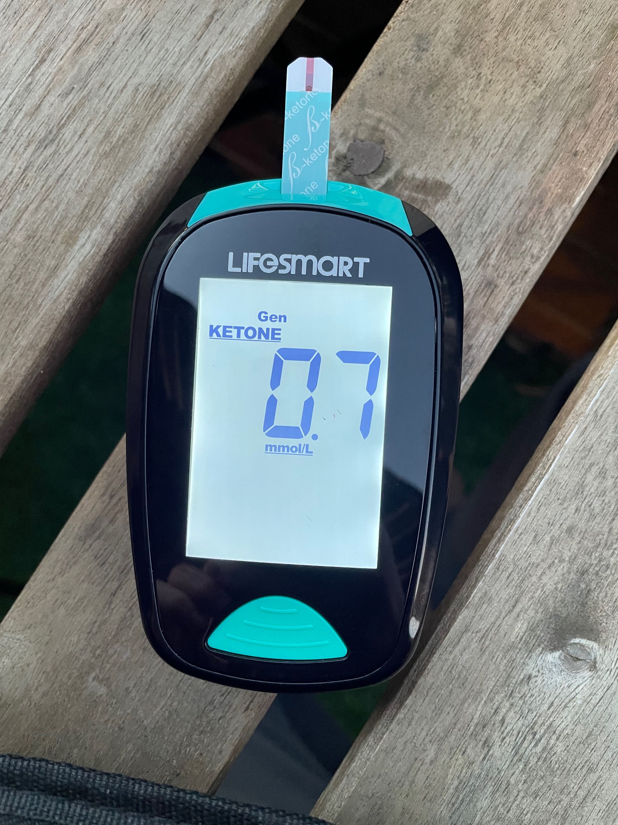 - 9:23 AM going for walk, blood ketones low (no measurement)